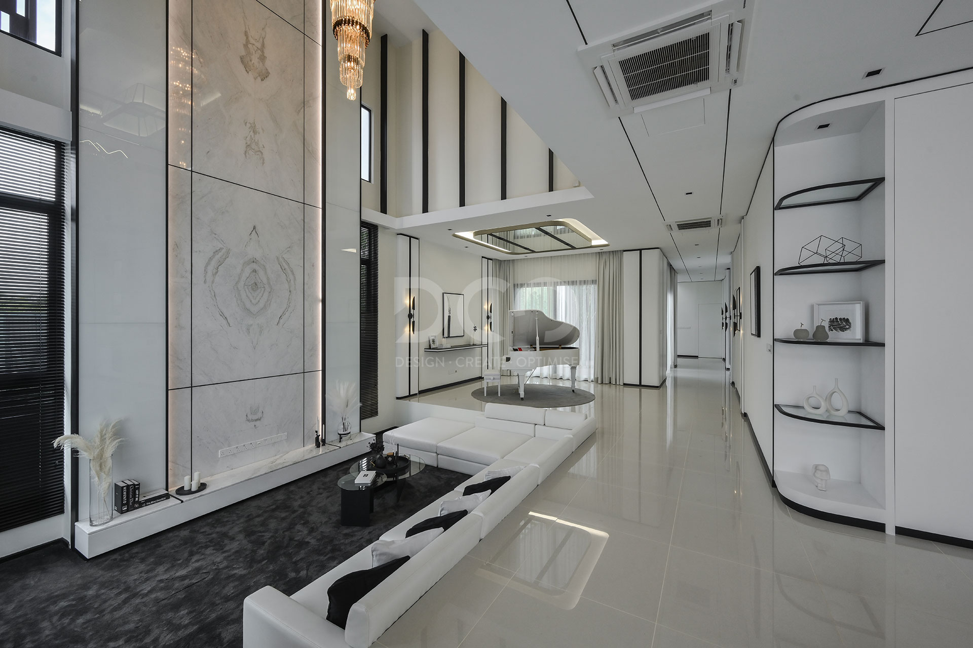Embrace open and expansive space. Feature wall featuring stone texture or marble pattern, becomes the highlight of space under lighting, promoting a contemporary luxe look to the space.